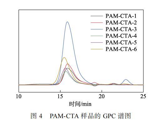 從表1可知,隨著DBTTC用量的降低,共聚物相對(duì)分子質(zhì)量逐漸增加,重均相對(duì)分子質(zhì)量(Mw)由5755增加到10505。這是因?yàn)?,隨著鏈轉(zhuǎn)移劑DBTTC用量的增加,反應(yīng)體系中DBTTC的濃度增加,鏈增長(zhǎng)自由基與鏈轉(zhuǎn)移劑DBTTC反應(yīng)生成休眠中間體,鏈增長(zhǎng)停止,PAM-CTA的相對(duì)分子質(zhì)量隨著鏈轉(zhuǎn)移劑用量的增加而降低,實(shí)現(xiàn)對(duì)PAM-CTA相對(duì)分子質(zhì)量的可控合成。由于PAM-CTA-4的分子量分布最窄,因此,選擇PAM-CTA-4進(jìn)行下一步反應(yīng)。