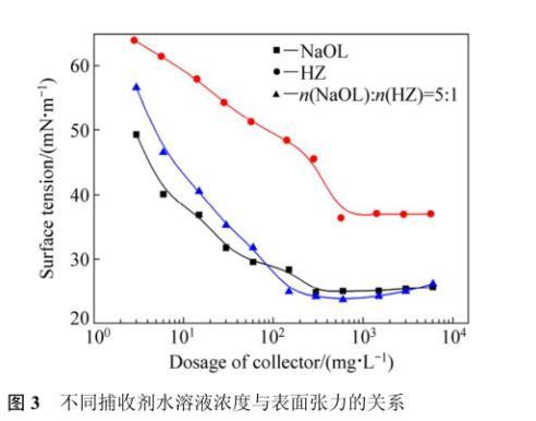 表面張力是影響浮選過程中氣泡的穩(wěn)定性,以及氣泡形成難易程度的主要參考數(shù)據(jù),臨界膠團濃度(簡稱CMC)是反映表面活性劑降低水溶液表面張力的效率。組合用藥的浮選效果優(yōu)于單一用藥,這可能與其在水溶液中的表面張力有一定的關(guān)系。圖3所示為最佳pH條件下(pH=9.0)組合捕收劑與兩種單一捕收劑的水溶液濃度與表面張力的關(guān)系。NaOL在水中微量的添加顯著地降低了水的表面張力,而隨著NaOL濃度的增加,溶液的表面張力逐漸下降,在濃度為302 mg/L時溶液的表面張力達到最低,為22.7~24.8 mN/m。此后NaOL濃度的增加并不能顯著地降低水的表面張力,所以可以確定NaOL的CMC值約為302 mg/L,與文獻中報道的1.03×10?3mol/L(308 mg/L)接近。而HZ的CMC值568 mg/L,表面張力36.37 mN/L。作為一種表面活性劑,其表面活性明顯不如NaOL,在較高濃度下,HZ才能形成膠團。浮選HZ用量為200 mg/L,低于其CMC值,在此濃度下,膠團未形成,表面張力較高,起泡性不佳,在單礦物浮選試驗中表現(xiàn)出了泡沫量小的特點。組合捕收劑水溶液的表面張力測試結(jié)果表明,CMC值約為150 mg/L,CMC值下水溶液表面張力為24.88 mN/m??梢奌Z的添加能降低NaOL的CMC值,這可能是NaOL作為一種陰離子型表面活性劑,親水“離子頭”之間的靜電作用較強,非離子表面活性劑的“插入”到親水“離子頭”之間,同時亞氨基也存在一定程度的解離,使得離子之間的靜電斥力減小。