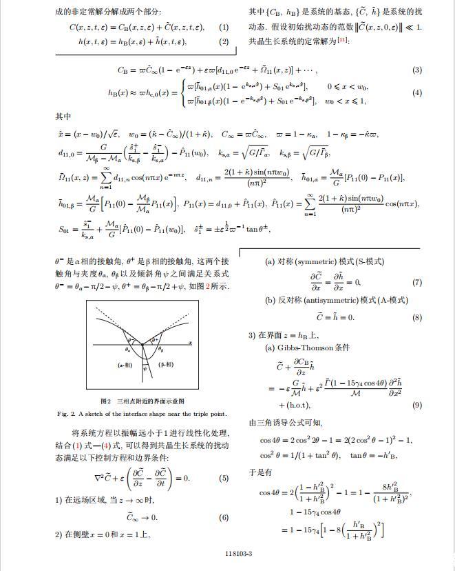 固體材料本身并非各向同性介質(zhì),其晶格結(jié)構(gòu)使固體體內(nèi)的物理量以及表面的物理參數(shù)依賴(lài)于取向,變?yōu)楦飨虍愋粤?固體材料這些物理參量的各向異性特征對(duì)凝固過(guò)程動(dòng)力學(xué)與界面穩(wěn)定性機(jī)理以至對(duì)界面微結(jié)構(gòu)圖案的形成與選擇造成重要的影響[14].王志軍等[15,16]研究了各向異性表面張力對(duì)定向凝固過(guò)程中初始平界面穩(wěn)定性的影響,發(fā)現(xiàn)各向異性表面張力的非線性效應(yīng)導(dǎo)致界面傾斜生長(zhǎng).Chen等[17]研究了各向異性表面張力對(duì)定向凝固過(guò)程中球晶生長(zhǎng)的影響,發(fā)現(xiàn)在各向異性表面張力作用下,球晶生長(zhǎng)初始階段部分界面首先向內(nèi)移動(dòng),達(dá)到一定的熔化深度后向外移動(dòng).Xu[18]研究了各向異性表面張力對(duì)定向凝固過(guò)程中枝晶生長(zhǎng)的影響,發(fā)現(xiàn)當(dāng)存在各向異性表面張力時(shí),枝晶系統(tǒng)具有兩種不同的整體不穩(wěn)定性機(jī)理:震蕩不穩(wěn)定性與低頻不穩(wěn)定性.陳明文等[19]研究了各向異性表面張力對(duì)定向凝固過(guò)程中深胞晶生長(zhǎng)的影響,發(fā)現(xiàn)當(dāng)各向異性表面張力增大時(shí),深胞晶界面全長(zhǎng)增大,根部低端的曲率半徑增大.本文應(yīng)用多重變量展開(kāi)法研究各向異性表面張力條件下定向凝固共晶生長(zhǎng)形態(tài)穩(wěn)定性,揭示了各向異性表面張力對(duì)共晶生長(zhǎng)不穩(wěn)定性區(qū)域大小的影響.
