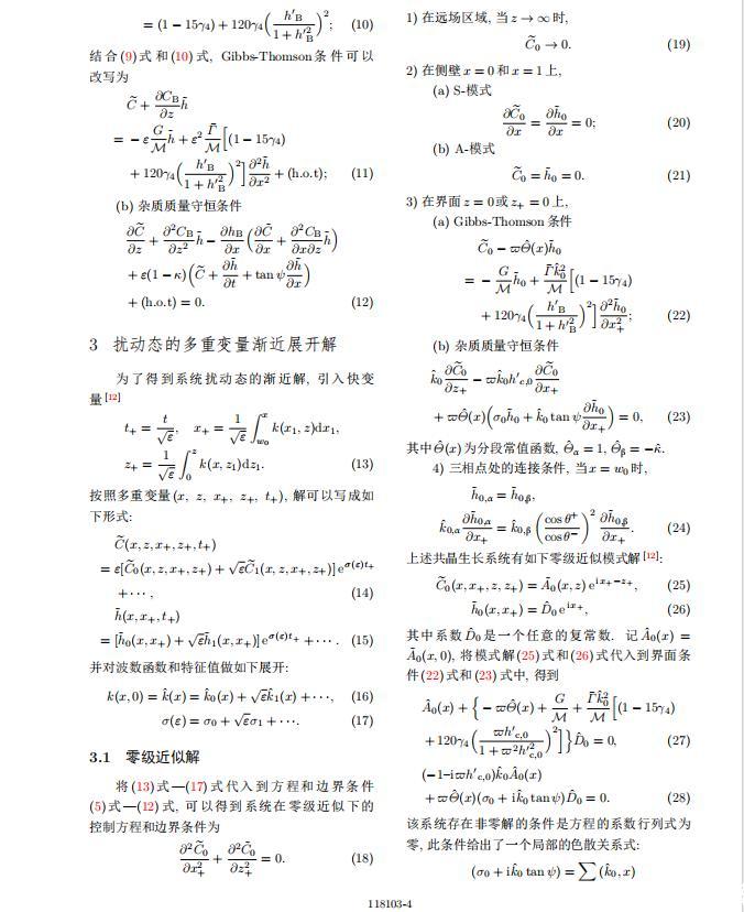 將系統(tǒng)方程以振幅遠(yuǎn)小于1進(jìn)行線性化處理,結(jié)合(1)式—(4)式,可以得到共晶生長(zhǎng)系統(tǒng)的擾動(dòng)態(tài)滿足以下控制方程和邊界條件: