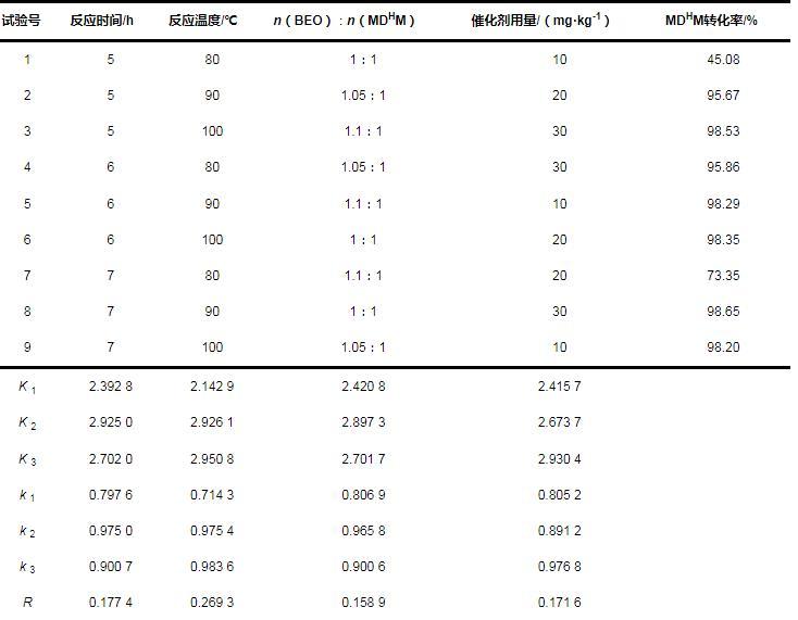 根據(jù)極差R的大小,確定各因素對(duì)反應(yīng)轉(zhuǎn)化率影響的大小順序?yàn)椋悍磻?yīng)溫度B>反應(yīng)時(shí)間A>催化劑用量D>原料配比C。通過正交試驗(yàn)結(jié)果確定釕催化合成工藝的最優(yōu)方案為A 2 B 3 C 2 D 3,即反應(yīng)時(shí)間6.0 h、反應(yīng)溫度100℃、n(BEO)∶n(MDHM)為1.05∶1、催化劑用量30 mg/kg。