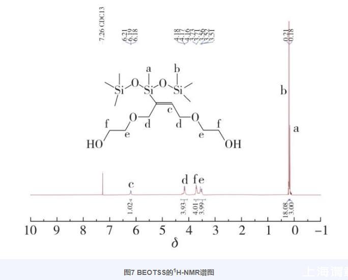 圖7為BEOTSS的1H-NMR譜圖。根據(jù)譜圖中的化學(xué)位移及積分?jǐn)?shù)據(jù)確定化合物中各基團(tuán)的氫歸屬,得到以下結(jié)果:1H-NMR(400 MHz,CDCl3),δ=6.24~6.16(m,—C=CH—,1H),4.17(m,—CH 2CCHCH 2—,4H),3.72(d,J=5.6 Hz,—CH 2—OH,4H),3.54(t,J=14.6 Hz,—O—CH 2—,4H),0.21(s,—Si(CH 3)3,18H),0.18(s,—SiCH 3,3H)。由于使用氘代氯仿作為溶劑,產(chǎn)物中的2個(gè)—OH為活潑氫,在譜圖中沒有出峰,同時(shí)結(jié)合紅外譜圖分析,進(jìn)一步證明本研究成功合成了目標(biāo)化合物BEOTSS。