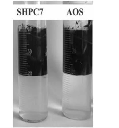 為驗(yàn)證SHPC7活性劑與其他表面活性劑的性能,通過(guò)乳化實(shí)驗(yàn)對(duì)SHPC7活性劑與AOS活性劑在乳化方面的乳化性能進(jìn)行觀察,從而可以得到如圖3的實(shí)驗(yàn)前后效果。