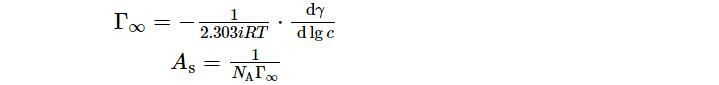 為了更全面地研究表面活性劑溶液性質(zhì),采用Gibbs吸附公式建立了表面吸附量和表面張力及活度之間的關(guān)系,根據(jù)表面活性劑表面張力變化曲線,可利用其得出表面飽和吸附量(Γ∞),由于表面活性劑溶液濃度很小,趨近于稀溶液,其活度可約等于濃度。再通過(guò)與阿伏伽德羅常數(shù)的數(shù)量關(guān)系,計(jì)算每個(gè)吸附分子在溶液表面所占的平均面積(AS)。因此可由如下公式計(jì)算: