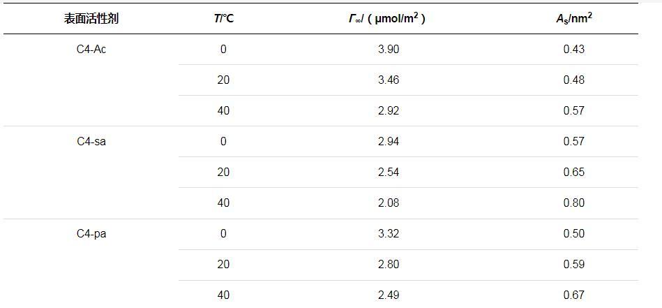 通常較高的?!藓洼^低的AS值表明表面活性劑分子密集地排列在空氣與水的界面上,由上述公式計(jì)算得到三種表面活性劑的Γ∞和較低的AS值如表2所示。對(duì)比參數(shù)可知,同種表面活性劑的?!蘧S溫度的升高而減小,AS有所增大,吸附表面的分子排布較為松散。這是由于溫度較高的情況下表面活性劑分子熱運(yùn)動(dòng)加劇,更易從吸附界面上脫離,并且因無(wú)規(guī)則運(yùn)動(dòng)導(dǎo)致吸附分子所占面積增大了。溫度升高導(dǎo)致溶解度的增加,因而表面的Γ∞會(huì)有所減小。由于Γ∞還受到表面張力隨濃度變化曲線斜率的影響,因此所得趨勢(shì)是綜合影響的結(jié)果。此外,由表中還可以看出,C4-sa分子的Γ∞最小,AS最大,在溶液表面的排列更加松散。這可能是由于親水端磺酸基團(tuán)之間強(qiáng)靜電排斥力,并且空間位阻較大。