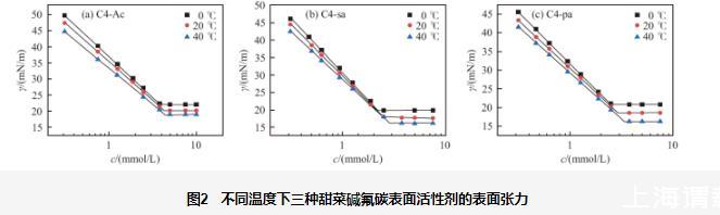 總體而言,溫度對(duì)甜菜堿氟碳表面活性劑的cmc影響較小。此外,在0~40℃的溫度范圍內(nèi),對(duì)比三種表面活性劑的表面活性參數(shù)可知,cmc值均小于4.45 mmol/L,γcmc均小于22.19 mN/m。親水端官能團(tuán)的不同對(duì)表面活性劑的性能具有一定的影響,當(dāng)溶液濃度足夠大時(shí),C4-Ac的表面張力相對(duì)較高,C4-sa和C4-pa具有較低的表面張力,后者略高于前者,并且C4-sa和C4-pa的cmc值低于C4-Ac。因?yàn)閺姆肿咏Y(jié)構(gòu)上來(lái)看,C4-Ac比C4-sa和C4-pa少一個(gè)有效碳,因此前者的疏水性要略弱于后二者,可以解釋表面張力和cmc的相對(duì)大小。