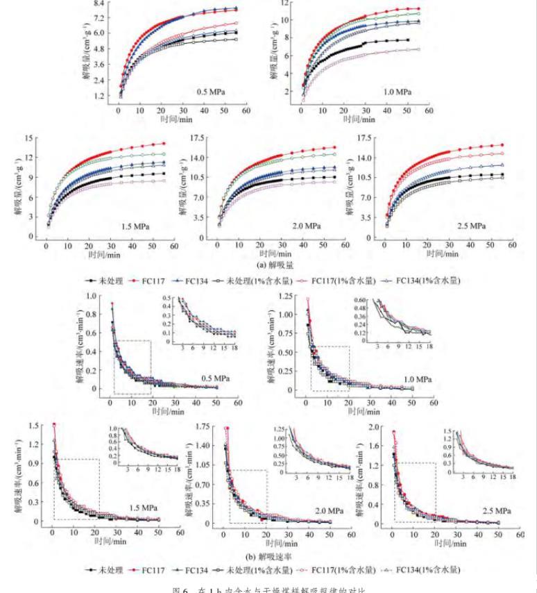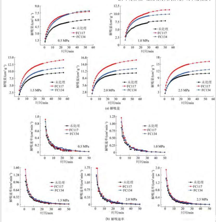 4)對(duì)經(jīng)過(guò)FC117和FC134處理后的干燥/含水煤樣進(jìn)行解吸量和解吸速率的測(cè)定,兩種表面活性劑處理后煤樣的解吸效果均有顯著的效果。在氣潤(rùn)濕反轉(zhuǎn)劑處理后的煤樣吸附量小于未處理的,而解吸量和解吸速率大于未處理的,則表明氣潤(rùn)濕反轉(zhuǎn)劑處理后的煤樣可以消除水鎖效應(yīng),增加解吸率,提高解吸效果。