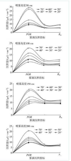 圖5不同噴霧距離和葉傾角條件下的流失點(POR)和最大穩(wěn)定持留量(Rm)