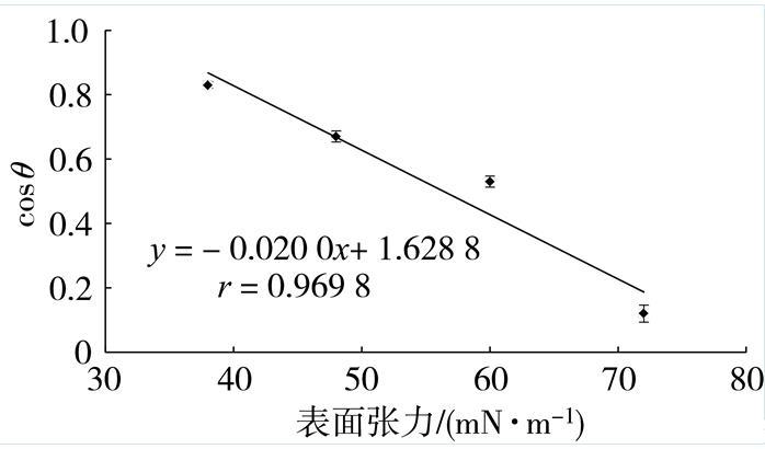 葉片臨界表面張力直接影響藥液在葉片表面的沉積特性,臨界表面張力越小越不利于藥液霧滴的沉積、潤濕和展布。測試液的表面張力與cosθ間呈顯著負相關(guān)關(guān)系(圖3),其擬合方程為y=0.020 0x+1.628 8(r=0.969 8),其中x為表面張力,y為cosθ。根據(jù)擬合方程計算得到煙草葉片的臨界表面張力為31.44 mN/m。與王亞虹等和陳海濤等測定的K326和云87兩個煙草品種相近,表明不同煙草品種葉片臨界表面張力值差異不大,且明顯低于小麥、棉花和茄子等,說明普通農(nóng)藥霧滴不容易在煙草葉片表面潤濕和展布,因此需要合理使用助劑降低農(nóng)藥藥液的表面張力至低于煙草葉片臨界表面張力。