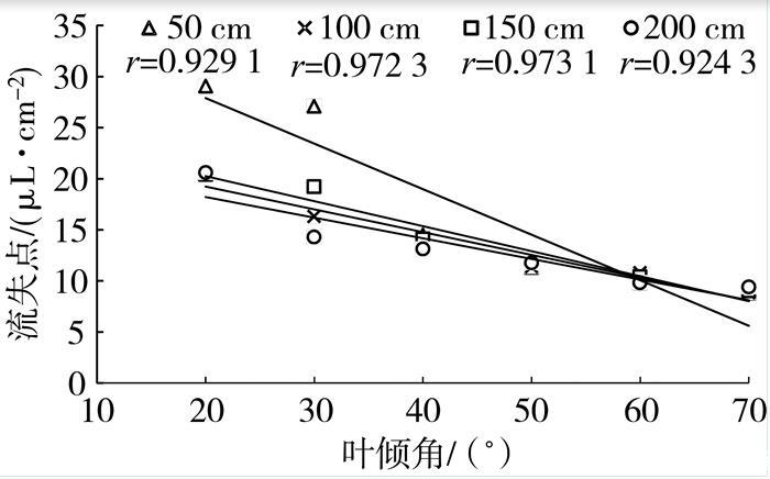 流失點是農(nóng)藥噴施量的關(guān)鍵決定參數(shù),當(dāng)農(nóng)藥噴施量超過流失點,會減少藥液在葉片表面的持留量,降低藥效且造成農(nóng)藥的浪費。圖4表明,流失點與葉傾角呈顯著負相關(guān),且隨著噴霧距離增加,斜率降低,說明葉傾角和噴霧距離對流失點均有顯著影響。
