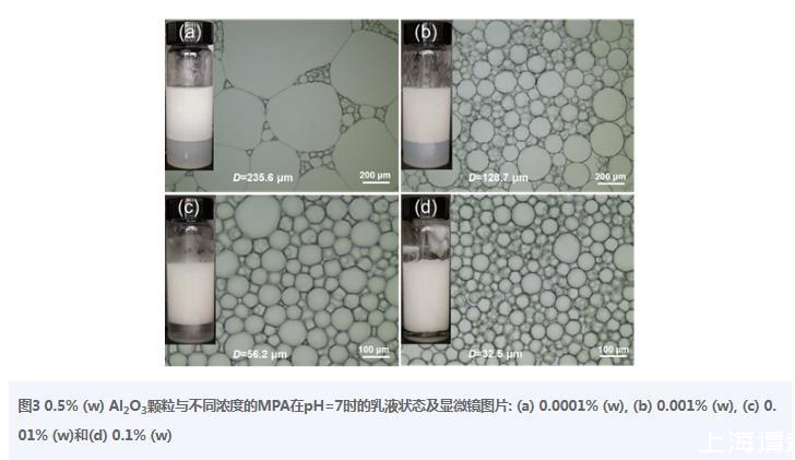 體系成份的濃度對(duì)乳液的外觀及粒徑有很大影響。圖3為固定0.5%(w)Al2O3顆粒濃度不變,研究在pH=7時(shí)不同MPA濃度對(duì)Pickering乳液的影響。隨著MPA濃度的不斷增加【0.0001%——0.1%(w)】,乳液下層析出的水相逐漸變澄清,說明MPA濃度增加,更多的Al2O3顆粒與MPA分子發(fā)生靜電相互作用,修飾后的Al2O3顆粒更容易從水相層中轉(zhuǎn)移到乳化層中,吸附在油水界面處,并且乳化層的高度也隨著MPA濃度的增加而升高,也說明更多的活性Al2O3顆粒參與乳化。乳液液滴粒徑隨濃度增加逐漸減小,從235.6μm降低到32.5μm,這是因?yàn)橛退缑嫣幍幕钚訟l2O3顆粒的量逐漸增多,可以穩(wěn)定更多的Pickering乳液液滴。