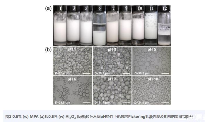 圖20.5%(w)MPA(a)和0.5%(w)Al2O3(b)顆粒在不同pH條件下形成的Pickering乳液外觀及相應(yīng)的顯微鏡圖片