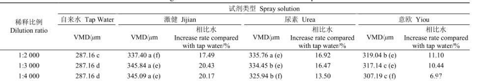 同一配比濃度下3種助劑溶液相比,激健溶液VMD最大,其次是尿素溶液。1:3 000配比時激健溶液相比于水將霧滴體積中徑增大20.43%,意歐溶液僅增大10.44%。尿素與意歐溶液在配比1:2 000時分別將粒徑增大16.92%、11.10%。