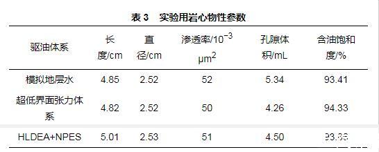 通過巖心動(dòng)態(tài)驅(qū)替實(shí)驗(yàn)評(píng)價(jià)體系提高采收率的能力,實(shí)驗(yàn)裝置見圖1。采用不間斷驅(qū)油的方式,以0.3 mL/min的注入流量驅(qū)油。分別考查模擬地層水、HLDEA+NPES體系和超低界面張力體系的驅(qū)油性能。實(shí)驗(yàn)用巖心物性參數(shù)見表3。實(shí)驗(yàn)的具體步驟如下。