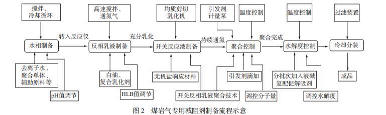 通過(guò)對(duì)水相制備—反相乳液制備—開(kāi)關(guān)反應(yīng)液制備—聚合控制—水解度控制—后處理等—系列過(guò)程中pH值、HLB值、引發(fā)劑、溫度等的控制,形成煤巖氣專用減阻劑制備流程,如圖2所示。
