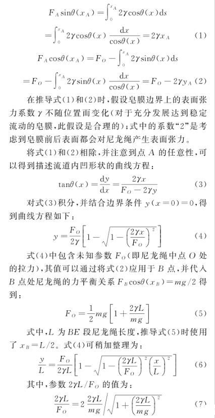 在推導(dǎo)式(1)和(2)時,假設(shè)皂膜邊界上的表面張力系數(shù)γ不隨位置而變化(對于充分發(fā)展達(dá)到穩(wěn)定流動的皂膜,此假設(shè)是合理的);式中的系數(shù)“2”是考慮到皂膜前后表面都會對尼龍繩產(chǎn)生表面張力。