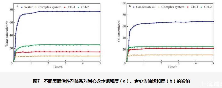 圖7不同表面活性劑體系對(duì)巖心含水飽和度(a)、巖心含油飽和度(b)的影響