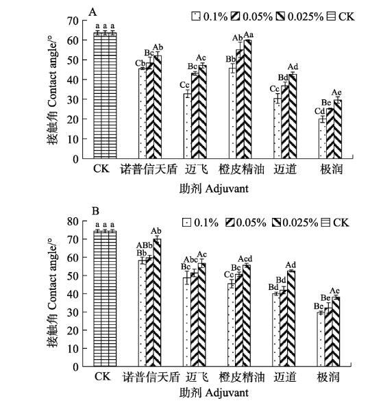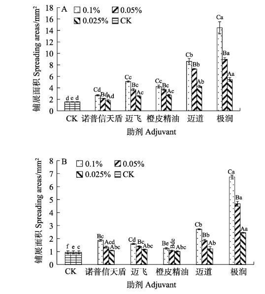 A:正面;B:背面。不同大寫(xiě)字母表示同種助劑不同濃度間差異顯著(P<0.05);不同小寫(xiě)字母表示同一濃度不同助劑間差異顯著(P<0.05)。