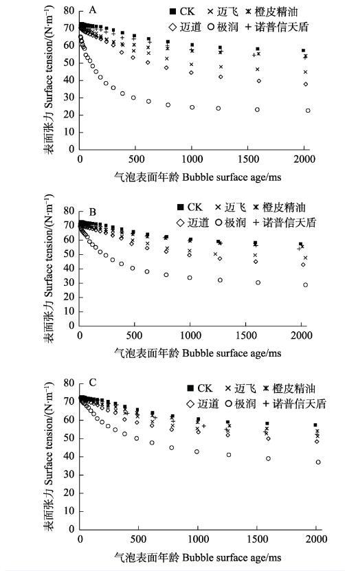某種液體形成新的表面時(shí),其表面張力與溶劑本身的表面張力相當(dāng),需要經(jīng)過(guò)一段時(shí)間表面張力才會(huì)降低到吸附平衡時(shí)的狀態(tài)。農(nóng)業(yè)上對(duì)病蟲(chóng)害進(jìn)行防治時(shí),藥液某段時(shí)間的動(dòng)態(tài)表面張力越低,藥液從噴頭噴出霧滴的粒徑越小,并且越容易在葉片上鋪展?jié)櫇?。添加不同種類(lèi)助劑產(chǎn)品后乙基多殺菌素藥液動(dòng)態(tài)表面張力的變化見(jiàn)圖2。當(dāng)氣泡年齡小于100 ms時(shí),藥液表面張力接近溶劑(水)的表面張力,之后隨著氣泡表面年齡的增加,各處理組表面張力的差異越顯著。助劑質(zhì)量分?jǐn)?shù)為0.1%時(shí),動(dòng)態(tài)表面張力的下降程度為極潤(rùn)>邁道>邁飛>諾普信天盾>橙皮精油。助劑質(zhì)量分?jǐn)?shù)為0.05%和0.025%時(shí),隨著助劑含量的降低,添加極潤(rùn)藥液的動(dòng)態(tài)表面張力降低到最小,其次是邁道,其他助劑產(chǎn)品的差異越來(lái)越不明顯。