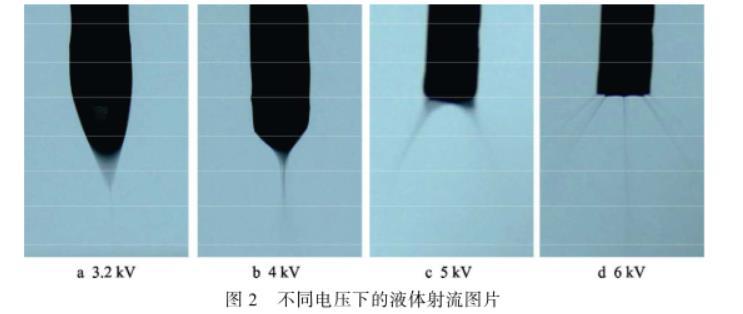 電壓越高,液體霧化成的液滴越細(xì)小。隨著電壓的升高,液滴霧化的射流狀態(tài)大致可以分為三種:滴狀模式、錐射流模式和多股射流模式。在較小的電壓(0~3 kV)下,噴嘴處液體所受的電場(chǎng)力小于表面張力,噴嘴中液體以滴狀形態(tài)落下,為滴狀模式。電場(chǎng)力逐漸增大,噴嘴液體被拉成細(xì)長(zhǎng)軸狀,形成連續(xù)的射流。進(jìn)一步增大電壓(如圖2a、b所示),液體在噴嘴處形成錐狀,且破碎成小霧滴,為錐射流模式,如圖2b所示,射流狀態(tài)最穩(wěn)定。