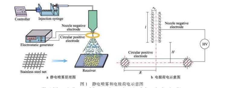 靜電噴霧裝置主要由高壓靜電發(fā)生器、控制器、微量注射器、噴嘴電極、環(huán)形電極和接收板組成,如圖1a所示。噴嘴電極連接高壓靜電發(fā)生器的負(fù)極,環(huán)形電極接高壓靜電發(fā)生器的正極。高壓靜電發(fā)生器輸出負(fù)高壓,在噴嘴電極會(huì)產(chǎn)生大量的負(fù)電荷,同時(shí)環(huán)形電極上會(huì)感應(yīng)出正電荷。調(diào)節(jié)靜電發(fā)生器的參數(shù),控制噴嘴電極和環(huán)形電極之間的電場(chǎng)強(qiáng)度。將微量注射泵固定在支架上,使用微量注射泵將溶液勻速泵送到噴嘴處。液體從噴嘴噴出時(shí)與高壓電極接觸,使電極上的電荷傳導(dǎo)到液體。帶電液體在靜電力、電荷互斥力、重力、環(huán)境復(fù)合力的作用下,破碎成細(xì)小液滴,并均勻地吸附在工件上。