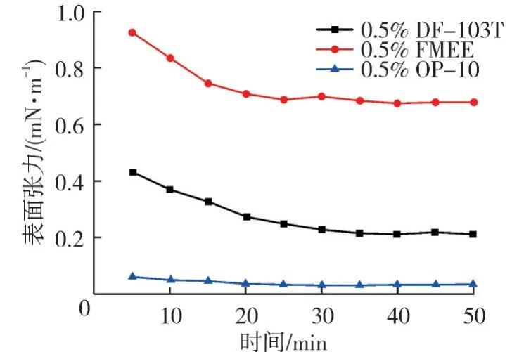 測(cè)定0.5%的DF-103T、OP-10、FMEE這3種非離子表面活性劑的表面張力,結(jié)果見(jiàn)圖2。