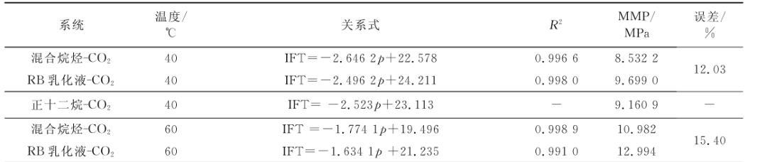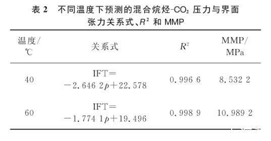 將擬合直線向橫軸方向繼續(xù)延伸,與壓力軸會有一個交點(diǎn),該交點(diǎn)的物理意義即界面張力為零時的壓力大小。根據(jù)CO2的驅(qū)油機(jī)理和最小混相壓力所表現(xiàn)的特征,該點(diǎn)的橫坐標(biāo)值即為實(shí)驗(yàn)對象在特定溫度下的MMP。表2列出了40℃和60℃下所測氣液之間的壓力與界面張力的關(guān)系式和相關(guān)系數(shù),以及對最小混相壓力的預(yù)測。