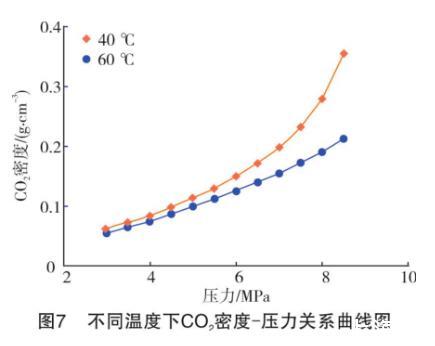 一方面,高溫可以對液體分子之間的相互作用力產(chǎn)生削弱作用,加劇分子間的不規(guī)則運(yùn)動。此時,CO2氣體分子更容易與液相發(fā)生混溶,而定量表現(xiàn)出來的就是界面張力的降低。另一方面,根據(jù)混合烷烴和CO2的密度和二者的密度差數(shù)據(jù),繪制出不同溫度下CO2氣體密度和氣液密度差隨壓力升高的變化曲線,如圖7~圖9所示。從密度差-壓力曲線(見圖9)來看,隨著溫度升高,在可比較的實(shí)驗(yàn)壓力范圍內(nèi),中低壓(3~6 MPa)下不同溫度的氣液密度差非常接近,可以忽略不計(jì)。但高于6 MPa后,高溫下氣液密度差逐漸加大。較高的密度差導(dǎo)致了氣液難以形成混相,同一壓力下界面張力更大。