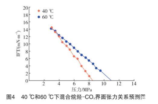 Kazemzadeh Y等的研究表明,平衡的CO2氣-油系統(tǒng)的界面張力通常隨著壓力線性降低,直到界面張力-壓力趨勢發(fā)生變化時,這時的壓力稱為臨界壓力,但界面張力為零的瞬間很難捕捉到。本實(shí)驗(yàn)中,在溫度為40℃、壓力為8.5 MPa時,可以觀察到滴液針管中的混合烷烴不再形成橢圓形液滴,直接和CO2發(fā)生混溶而無斷續(xù)地流入釜中,所以無法通過實(shí)驗(yàn)測量準(zhǔn)確地得到CO2和混合烷烴界面張力為0時的對應(yīng)壓力,即最小混相壓力。因此,采用外推法預(yù)測最小混相壓力。以橫軸為壓力值,縱軸為混合烷烴在被鹽水飽和的CO2環(huán)境下界面張力值的坐標(biāo)系中分別繪制40℃和60℃壓力和界面張力的散點(diǎn)圖,如圖4。從圖4可看出,隨著壓力的升高,界面張力呈線性降低的趨勢。