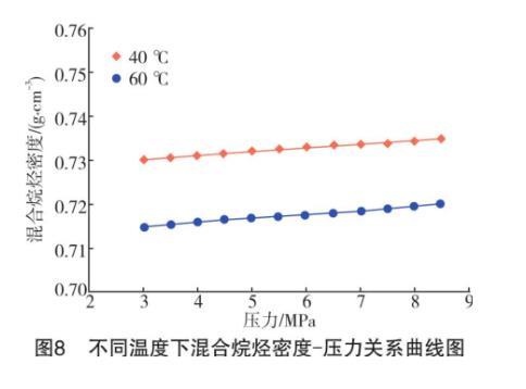 從混合烷烴密度-壓力曲線(見圖8)來看,整個測試壓力區(qū)間內(nèi)溫度對混合烷烴的密度影響不大,因此液體密度也不會造成界面張力的較大變化。從CO2密度-壓力曲線(見圖7)來看,溫度在中高壓下對CO2密度的影響較大。尤其是在3.5 MPa之后,60℃下的氣體密度隨著壓力升高速率明顯高于40℃時的速率。在同一壓力下,氣體密度隨著溫度升高顯著降低。密度較低的CO2氣體分子分布越稀疏,與烷烴液面直接接觸的氣體分子越少,故降低了二者發(fā)生萃取和混溶的概率,間接地導(dǎo)致液體的界面張力值增加。
