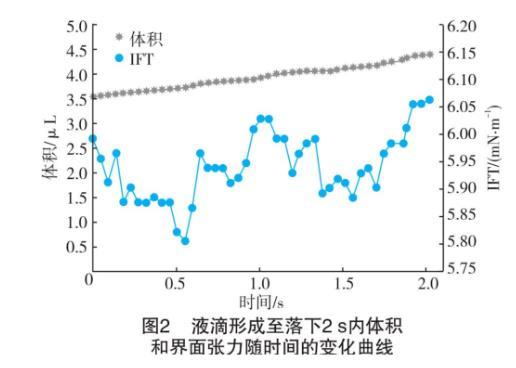 圖2為40℃、6.5 MPa時,液滴形成至落下的2 s內(nèi)液滴體積和測得的界面張力隨時間的變化。由圖2可看出,在落下過程中體積逐漸變大,界面張力誤差在0.3 mN/m之內(nèi),雖然浮動不是很大,但任取一點(diǎn)不能較好地體現(xiàn)整體。因此,選擇在懸滴完全形成開始計(jì)算,到完全落下以幀為間隔,因?yàn)橐旱瓮耆纬蓵r可以較清晰地得到液滴的最大曲率半徑,批量計(jì)算這段時間內(nèi)的界面張力值,最后得到其平均值。為避免液滴的隨機(jī)性,在每種環(huán)境下選取3個連續(xù)滴落的液滴的平均界面張力值作為最終結(jié)果。減少了實(shí)驗(yàn)的偶然性,使得到的結(jié)果更加可信。