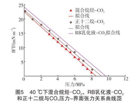 假設(shè)RB乳化液-原油不考慮斜率變化部分,始終以低壓階段(小于6 MPa)的斜率表示界面張力的變化。將表中同一溫度下不同系統(tǒng)的關(guān)系式展現(xiàn)在曲線圖上(見圖5和圖6)。從圖5和圖6可知,不論在哪個溫度下,混合烷烴和RB乳化液的壓力-界面張力曲線都接近平行,即兩種油的界面張力隨著壓力的升高幾乎以同樣的速度降低。計(jì)算得知,40℃和60℃下實(shí)驗(yàn)混合烷烴和RB原油的壓力-界面張力關(guān)系式中的斜率誤差為6.0%和8.6%??v觀兩種油的組成發(fā)現(xiàn),本實(shí)驗(yàn)所使用的混合烷烴中正十二烷的摩爾分?jǐn)?shù)達(dá)71.07%,而RB原油中的C12+的摩爾分?jǐn)?shù)達(dá)到57.66%。也就是說,混合烷烴和原油的組分中占主導(dǎo)作用的是高碳數(shù)的正構(gòu)烷烴。據(jù)姬澤敏等的大量實(shí)驗(yàn)研究,界面張力在不同的正構(gòu)烷烴-CO2體系中具有極好的規(guī)律性,在相同的溫度壓力條件下,正構(gòu)烷烴的碳數(shù)和界面張力成正比關(guān)系。從文獻(xiàn)中RB原油組成分析得知,C12+的分子量高達(dá)366 g/mol,而本實(shí)驗(yàn)中的混合烷烴的分子量僅為156.74 g/mol。由此得知,實(shí)驗(yàn)誤差的主要來源是高碳正構(gòu)烷烴的組成不同。