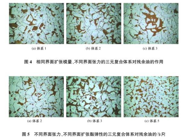 圖5不同界面張力、不同界面擴(kuò)張黏彈性的三元復(fù)合體系對(duì)殘余油的作用