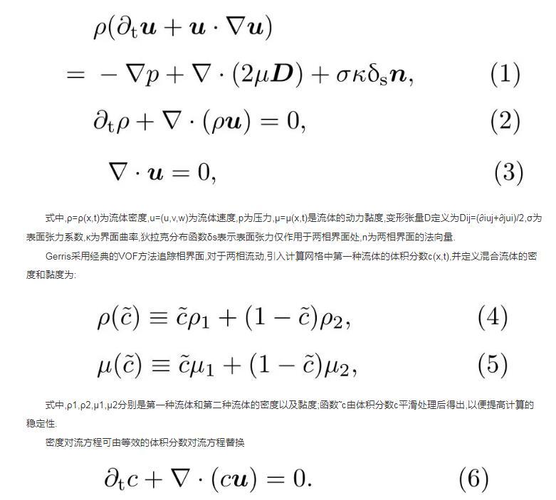 Gerris采用經(jīng)典的VOF方法追蹤相界面,對于兩相流動(dòng),引入計(jì)算網(wǎng)格中第一種流體的體積分?jǐn)?shù)c(x,t),并定義混合流體的密度和黏度為: