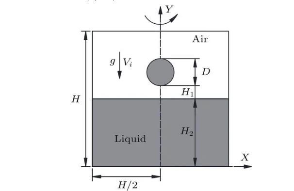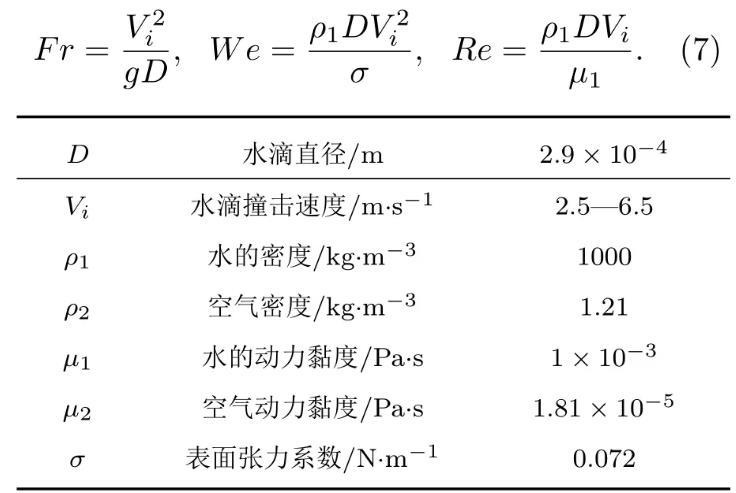 如圖1所示,水滴撞擊深水液池的數(shù)值模擬在軸對稱坐標(biāo)系中進(jìn)行,Y軸為計(jì)算區(qū)域的對稱軸,D為初始水滴直徑,R=D/2,正方形計(jì)算區(qū)域的長度H=20D,水滴距離液面的距離H1=0.1D,液池深度H2=12D以消除底部對液滴撞擊運(yùn)動(dòng)的影響,水滴在重力g和撞擊速度Vi的作用下撞擊液池。采用雷諾數(shù)、韋伯?dāng)?shù)和弗勞德數(shù)來描述液滴撞擊的運(yùn)動(dòng)特征,三者分別表征液體慣性力與黏滯力間的關(guān)系、液體慣性力與表面張力間的關(guān)系以及液體慣性力與重力間的關(guān)系。三個(gè)無量綱參數(shù)的表達(dá)式如(7)式所示,主要物理參數(shù)如表1所列。
