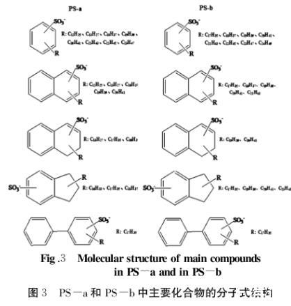 對于PS-b,相對含量較大的20個化合物中,按照相對含量大小依次為:烷基萘磺酸鹽(C17~C21)、烷基苯磺酸鹽(C17~C24)、烷基茚滿磺酸鹽(C17~C21)、烷基四氫萘磺酸鹽(C19~C20);而對于PS-a,按照相對含量大小依次為:烷基苯磺酸鹽(C11~C13、C18~C23)、烷基萘磺酸鹽(C12、C18~C20)、烷基茚滿磺酸鹽(C16~C18)、烷基四氫萘磺酸鹽(C13、C17~C18)。