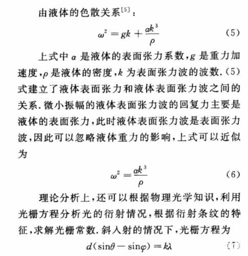 d為光柵常數(shù),在此情況下,光柵常數(shù)即為液體表面張力波的波長,θ為斜入射角,φ為衍射角,k為衍射級次,λ為光波的波長。通過測量觀測距離、衍射條紋的間距等量可求出衍射角和光柵常數(shù)。再根據(jù)液體的色散關(guān)系(5)式,求得液體表面張力。具體的測量和求解過程,這里不再贅述。
