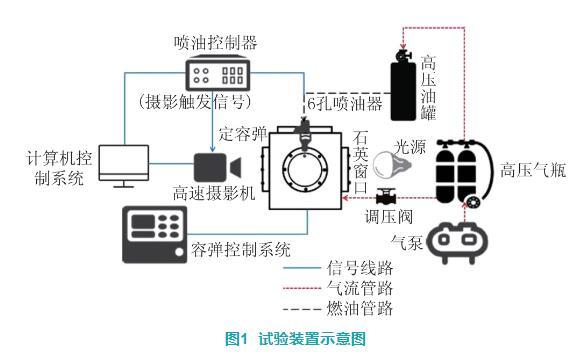 圖1為試驗(yàn)裝置示意圖,主要由計(jì)算機(jī)控制系統(tǒng)、噴油系統(tǒng)控制器、高壓燃料供給系統(tǒng)、定容彈系統(tǒng)、高速攝像裝置等組成。