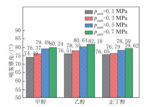 圖3環(huán)境壓力對(duì)醇類燃料噴霧錐角的影響