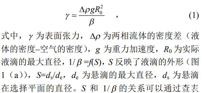 試驗為比較3種液體表面張力的大小,采用懸滴法對液體的表面張力進(jìn)行測量,懸滴法的基本原理是:處于毛細(xì)管端液體懸滴的形狀與液體的表面張力有關(guān),在重力作用下,毛細(xì)管端形成的球形液滴的形變,隨著液滴有效密度的增加而增加并隨著液滴界面張力的增加而減小。通過Young–Laplace方程可以推導(dǎo)得到懸滴法計算表面張力的基本方程: