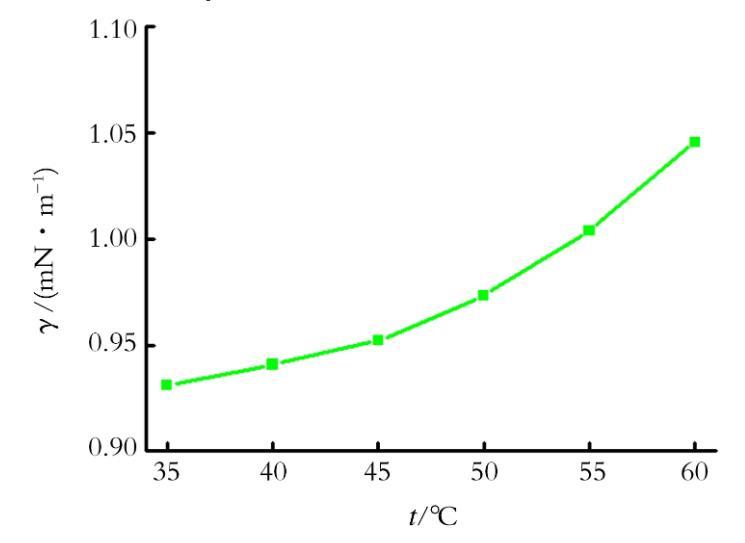圖3為CPFE質(zhì)量濃度為40 mg/L時(shí),不同溫度下大慶采油三廠原油體系的油-水界面張力。