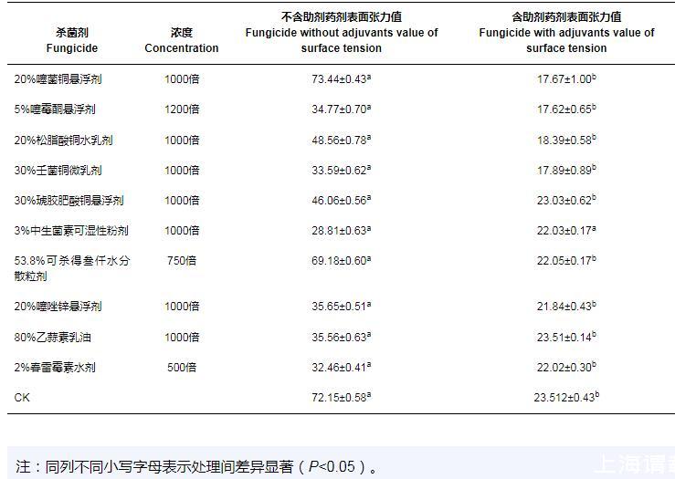 參照各供試殺菌劑田間推薦劑量,分別配置10 mL藥液2組,其中一組添加助劑,一組不含助劑。通過表面張力儀測試各藥液的表面張力值。每組設(shè)置3個(gè)重復(fù),以水作為空白對照。