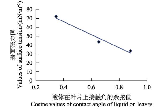 臨界表面張力是固-液界面化學(xué)中表征固體表面能的一個(gè)重要指標(biāo),用來說明液體在固體表面的可潤濕性。將水、DMF、DMSO液體點(diǎn)滴在芒果葉面上,測試液體的接觸角(表1),以液體表面張力值和接觸角的cosθ值分別為橫縱坐標(biāo)通過Zisman法作圖,得到接觸角與表面張力的回歸直線(圖1),得到回歸方程y=-73.7x+96.01(R=0.9664),當(dāng)接觸角為零時(shí)對應(yīng)的液體表面張力值即為‘貴妃'芒果葉的臨界表面張力值,結(jié)果測得‘貴妃'芒果葉片的臨界表面張力值為22.31 mN/m。