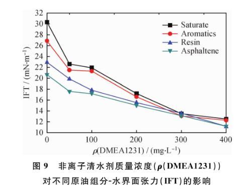 圖9非離子清水劑質(zhì)量濃度(ρ(DMEA1231))對不同原油組分-水界面張力(IFT)的影響
