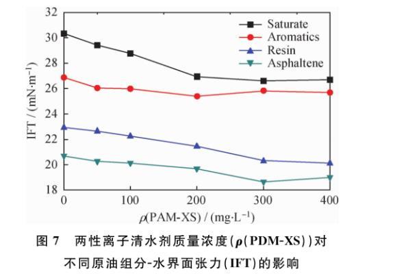 圖7兩性離子清水劑質(zhì)量濃度(ρ(PDM-XS))對不同原油組分-水界面張力(IFT)的影響