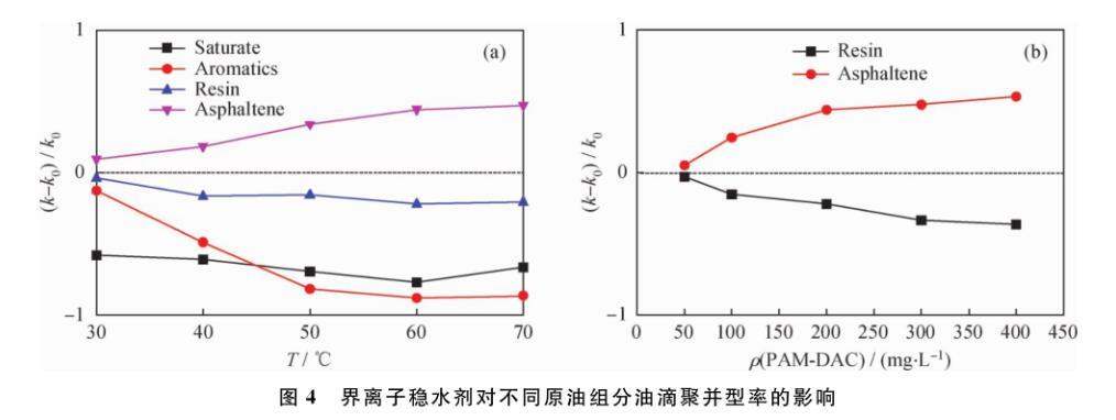 圖4陽離子清水劑對不同原油組分油滴聚并速率的影響
