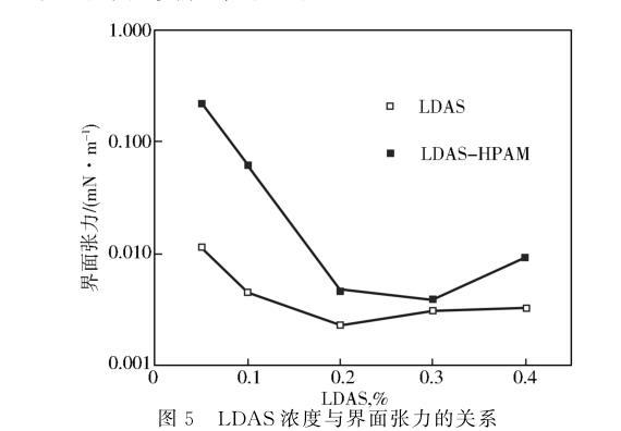 實驗固定聚合物濃度0.12%HPAM,改變LDAS用量,70℃下測試驅(qū)油體系與原油之間的界面張力,實驗結(jié)果見圖5。