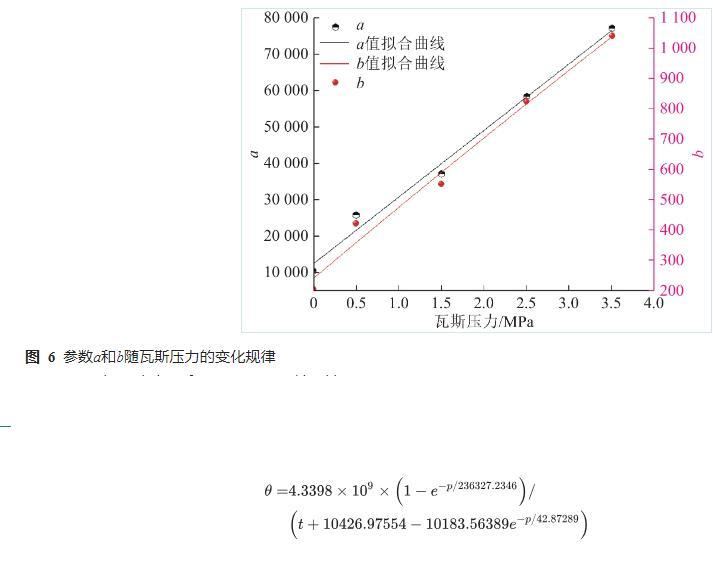由圖5可知,同一瓦斯壓力下,接觸角隨著時間的增加而逐漸減小,說明水分在含瓦斯煤表面發(fā)生了浸潤現(xiàn)象。接觸角θ與時間t滿足的關(guān)系,參數(shù)a和b的值如圖6所示。參數(shù)a與壓力p滿足的關(guān)系,參數(shù)b與壓力p滿足的關(guān)系。接觸角與壓力及時間的關(guān)系如式(4)所示。