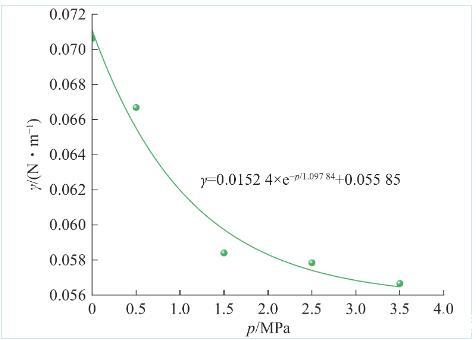 由圖4可知,水與瓦斯之間的表面張力隨著瓦斯壓力的增加而減小,表面張力與瓦斯壓力滿足負指數(shù)的關(guān)系,如式(3)所示。在水與瓦斯的界面,水分子兩側(cè)分別與瓦斯分子、液體分子接觸,表面分子受到的朝向液體內(nèi)部的吸引力大于氣體分子的吸引力。隨著瓦斯壓力的增加,水與瓦斯接觸表面之間的密度差逐漸減小,瓦斯分子對水分子的引力逐漸變大,抑制了液體表面分子向液體內(nèi)部的運動,使系統(tǒng)的能量趨向于平衡狀態(tài)。因此,水與瓦斯之間的表面張力隨著瓦斯壓力的增加而減小。