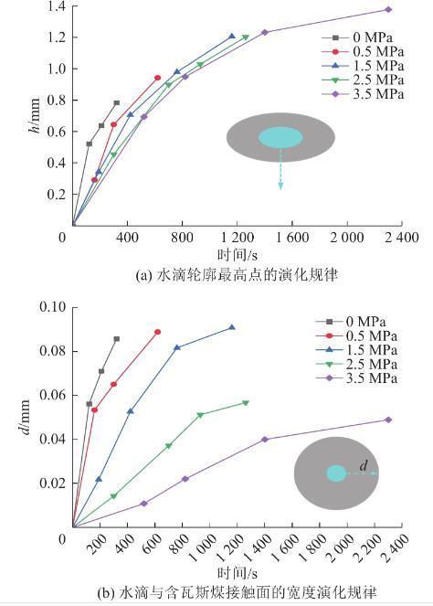 由圖9a可知,同一瓦斯壓力條件下,水滴輪廓最高點下降的高度逐漸增加,然而增加的速率逐漸減小,其主要是因為水分在煤中孔隙流動所受的黏滯力所致。同一時間,瓦斯壓力越大,水滴輪廓最高點下降的高度越小。由前述分析可知,瓦斯壓力越大,水分對煤體潤濕的難度越大,水分越難浸潤含瓦斯煤體,因此呈現(xiàn)出瓦斯壓力越大,水滴輪廓最高點下降的高度越小的規(guī)律。由圖9b可知,同一瓦斯壓力條件下,水滴與含瓦斯煤接觸面的寬度逐漸增加,然而增加的速率逐漸減小,其主要也是因為水分在煤中孔隙流動所受的黏滯力所致。同一時間,瓦斯壓力越大,水滴與含瓦斯煤接觸面寬度增加的越小,其說明瓦斯壓力越高,水分越不容易在含瓦斯煤表面鋪展。水滴與含瓦斯煤表面的接觸是一個動態(tài)潤濕的過程,基于對圖9a—圖9b的分析可知,瓦斯壓力的增加一方面不利于水分浸潤到煤體中,另一方面不利于水分對煤體表面潤濕范圍的增加。